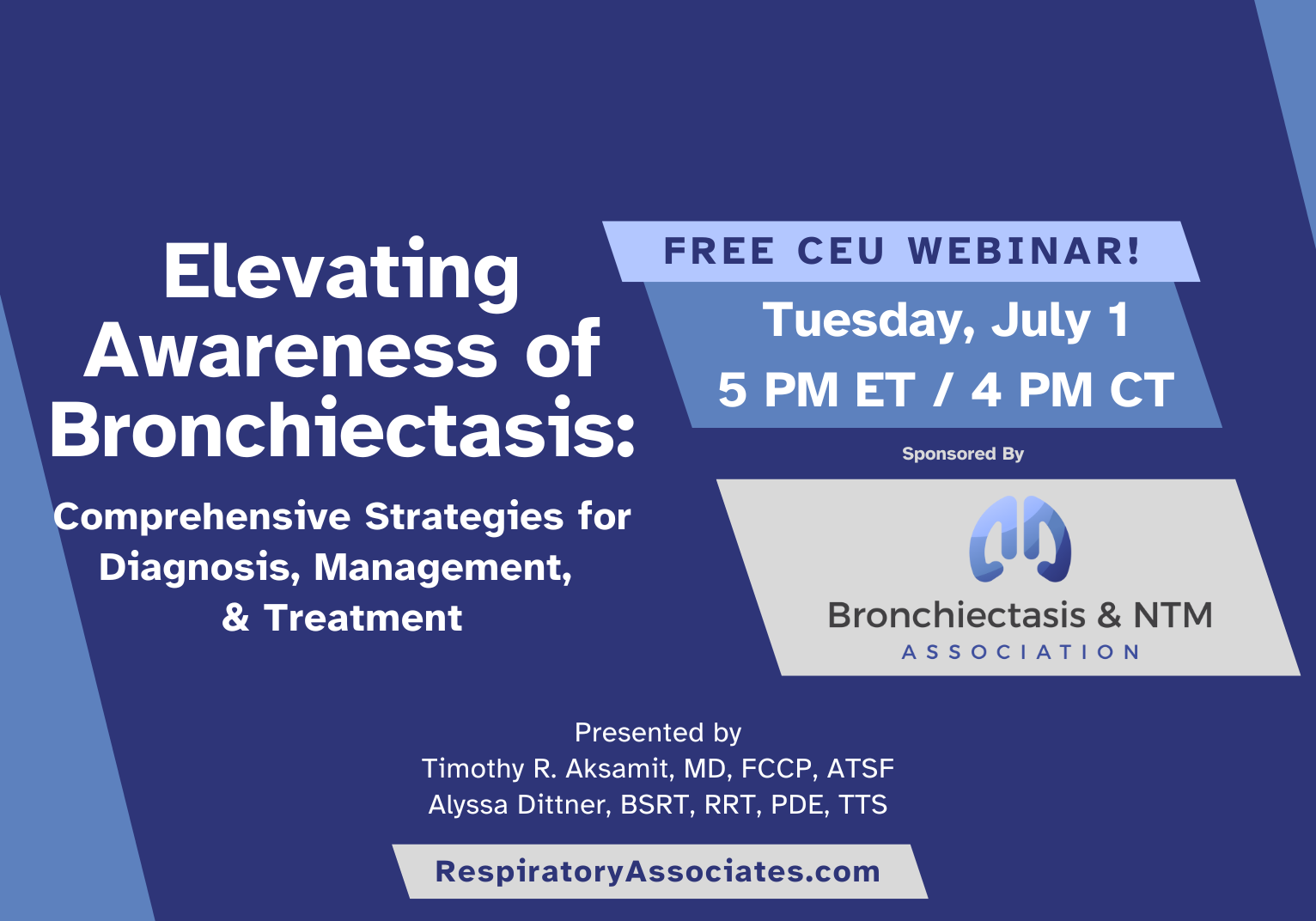 This broadcast is sponsored by The Bronchiectasis & NTM Association. The Bronchiectasis and NTM Association is dedicated to improving the lives of people affected by bronchiectasis and NTM (nontuberculous mycobacterial) lung disease. The Association is committed to advancing high-quality, specialized care, research, education, support, and advocacy within the bronchiectasis and NTM lung disease communities, helping people live longer, healthier lives. Their sponsorship is allowing you to take this class for free.